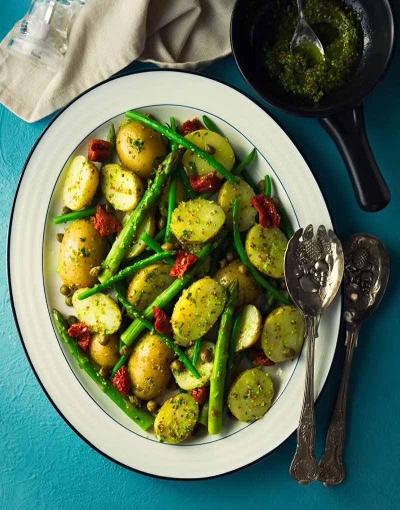 Dressed while still warm, the tiny new potatoes in this salad absorb masses of flavour from the herbs and miso in the bright green dressing. Whether served warm or allowed to cool, this is a lighter and more nutritious take on traditional potato salads and allows you to use any combination of your favourite herbs and leaves. If you aren’t able to lay your hands on pea shoots, then a handful of rocket or watercress will work perfectly.